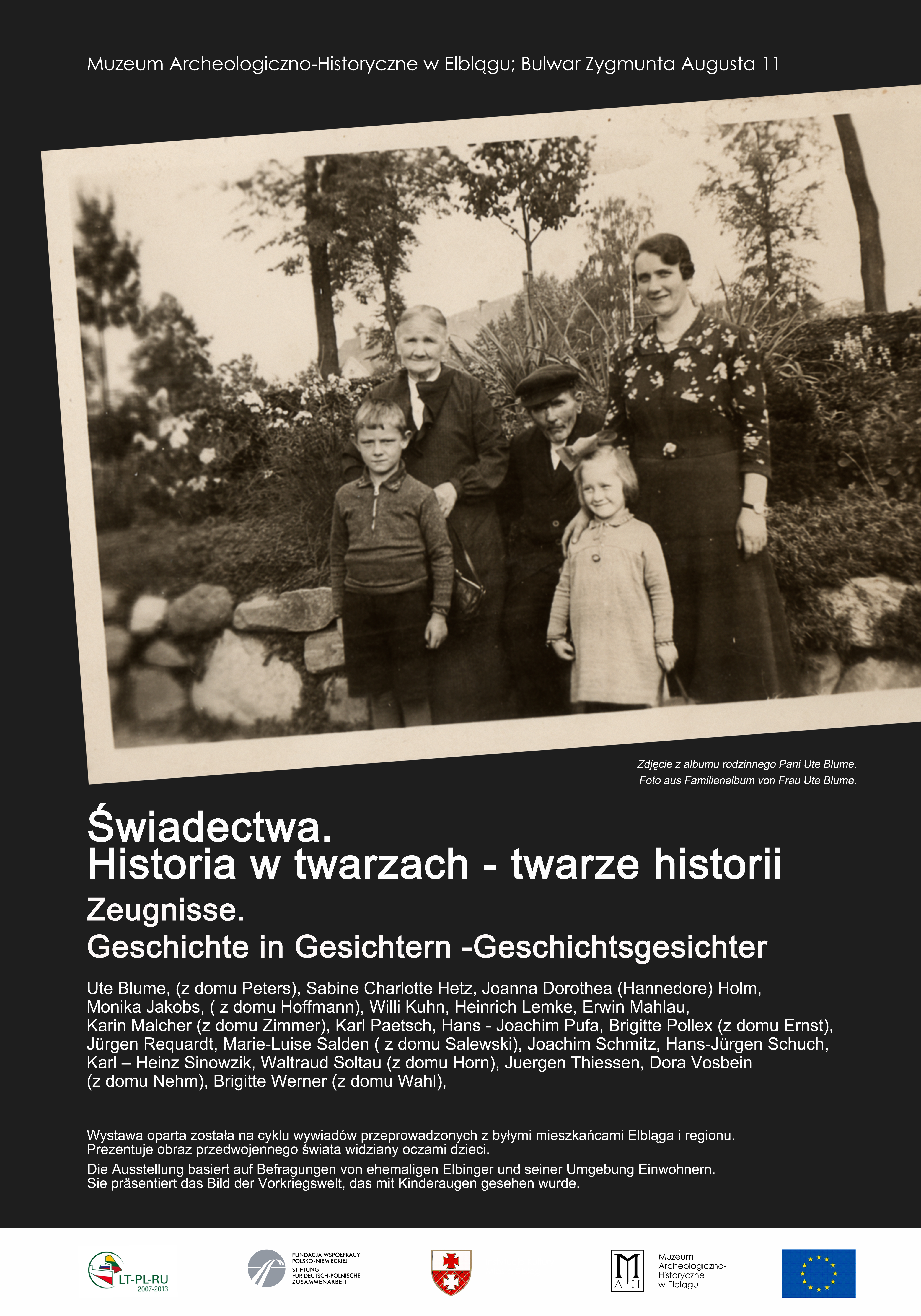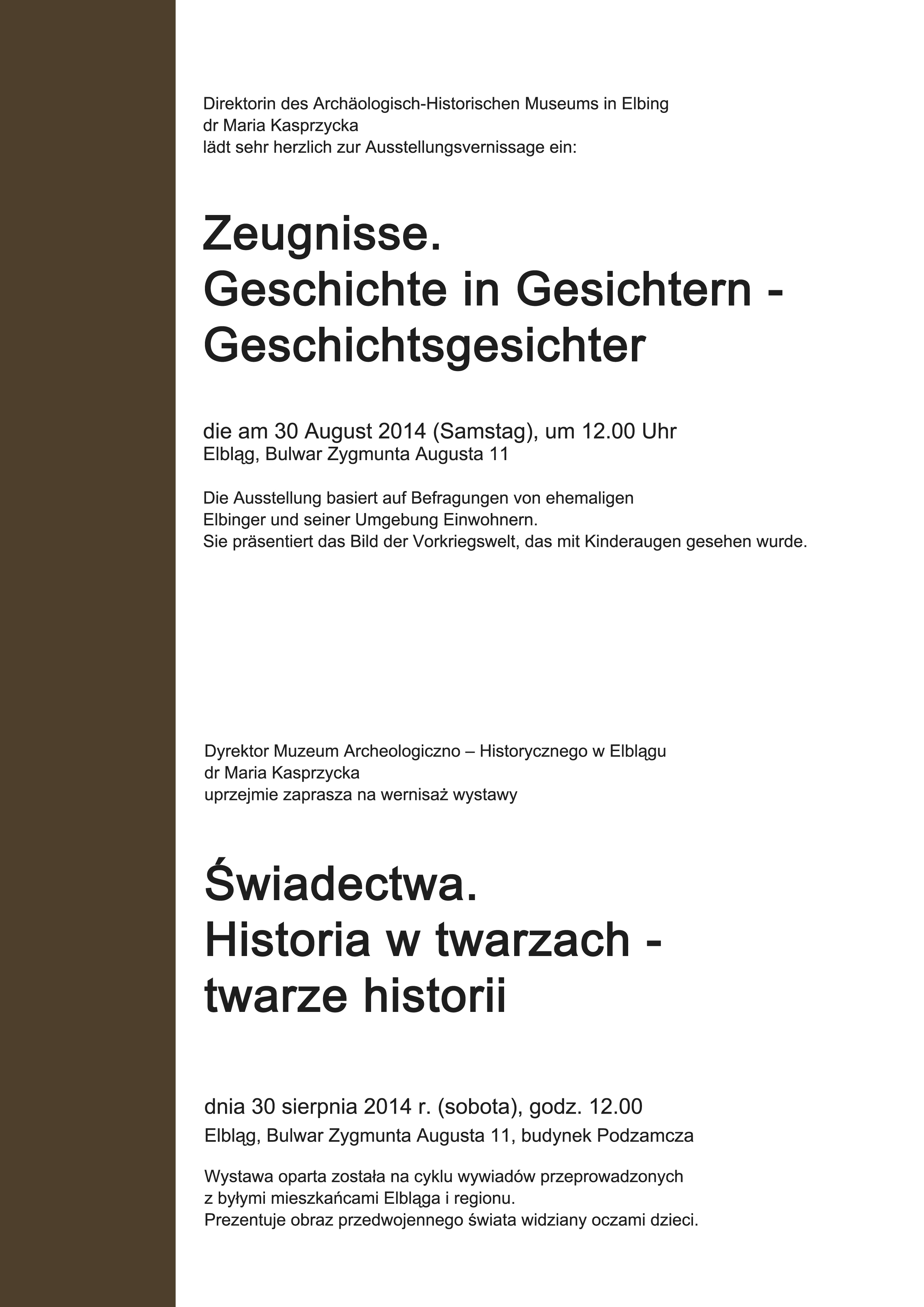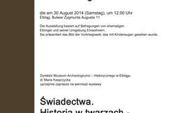Wystawa "Świadectwa. Historia w twarzach – twarze historii" przeniesie nas w świat przedwojennego Elbląga, widzianego oczami dzieci. Mieszkańcy Elbląga, którzy po wojnie zostali zmuszeni do opuszczenia miasta opowiedzą nam m in. o swoich zabawkach, miejscach wycieczek i dziecięcych zabawach, obowiązkach, nauce, ulubionych potrawach, modzie, świętach, czy wschodniopruskich zwyczajach. Wystawa wzbogacona została o rodzinne pamiątki, archiwalne zdjęcia rodzinne oraz aranżacje wnętrz z epoki. Na odwiedzających będzie również czekać m. in przymierzalnia z kopiami strojów z lat 20 – 40 – tych XX wieku, kącik zabawach dla najmłodszych z kopiami zabawek oraz interaktywna makieta jednego z najważniejszych miejsc dawnego Elbląga- Placu Fryderyka Wilhelma.