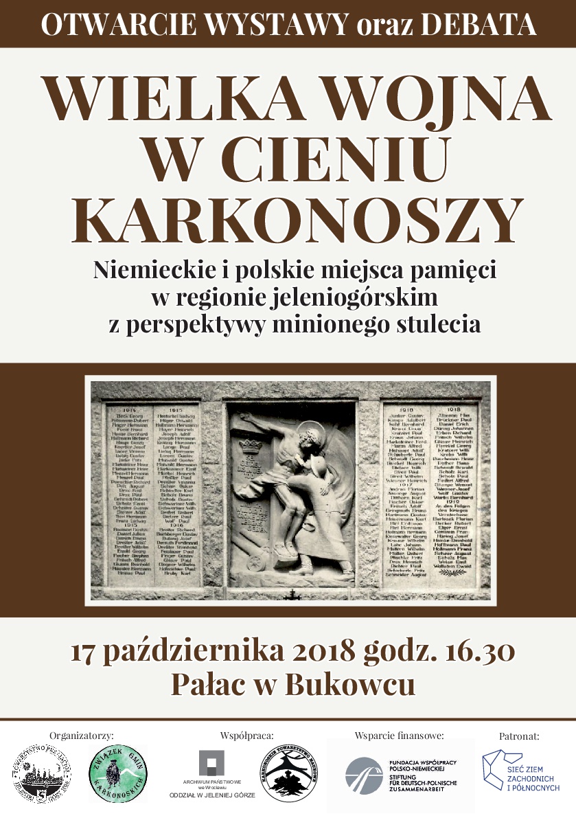 Towarzystwo Przyjaciół Jeleniej Góry oraz Związek Gmin Karkonoskich zapraszają na otwarcie wystawy oraz debatę poświęconą upamiętnieniom I wojny światowej w regionie i ich losom po 1945 oraz 1989 r. Podczas spotkania wykład wprowadzający wygłosi prof UWr. dr hab. Tomasz Przerwa (Instytut Historyczny Uniwersytetu Wrocławskiego), natomiast otwarcia wystawy dokona Ivo Łaborewicz (TPJG, Archiwum Państwowe we Wrocławiu Oddział w Jeleniej Górze). Wydarzeniu towarzyszyć będzie prezentacja najnowszych wydawnictw Towarzystwa.