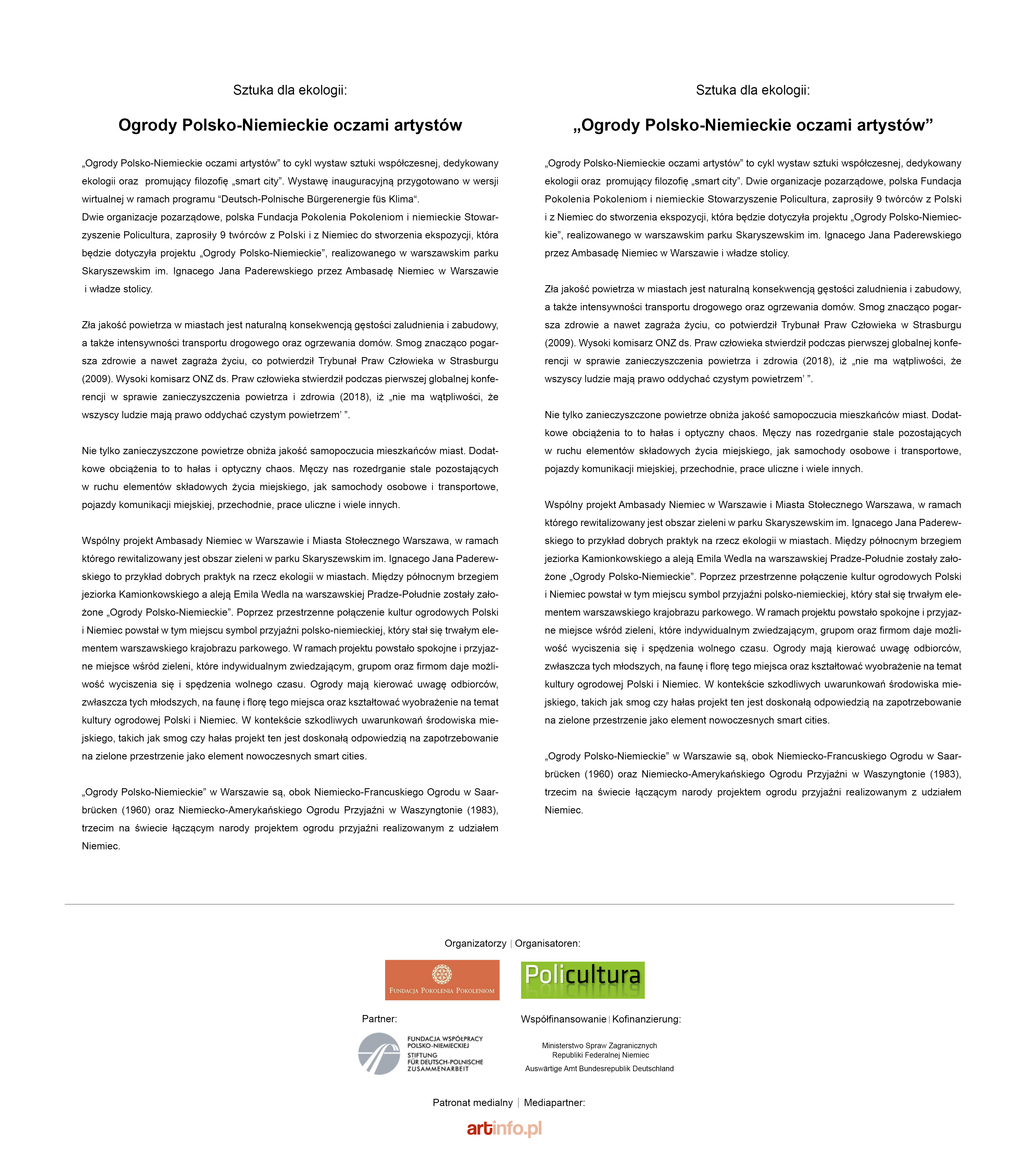 Wystawa powstała w związku z inicjatywą „Ogrody Polsko-Niemieckie”, realizowaną w warszawskim Parku Skaryszewskim przez Ambasadę Niemiec w Polsce i władze M.St. Warszawy, w ramach projektu "Deutsch-Polnische Burgerenergie furs Klima" Ministerstwa Spraw Zagranicznych RFN.