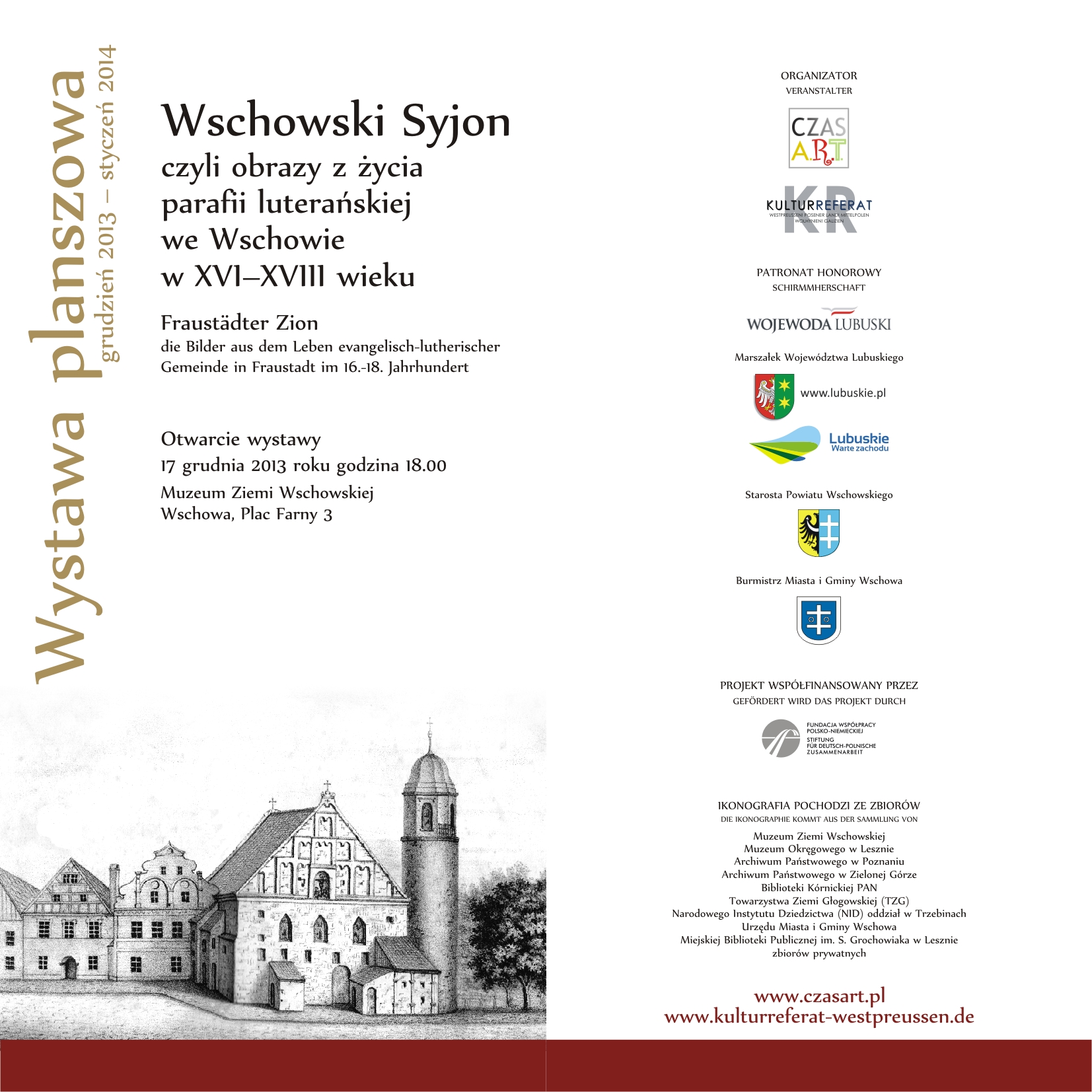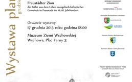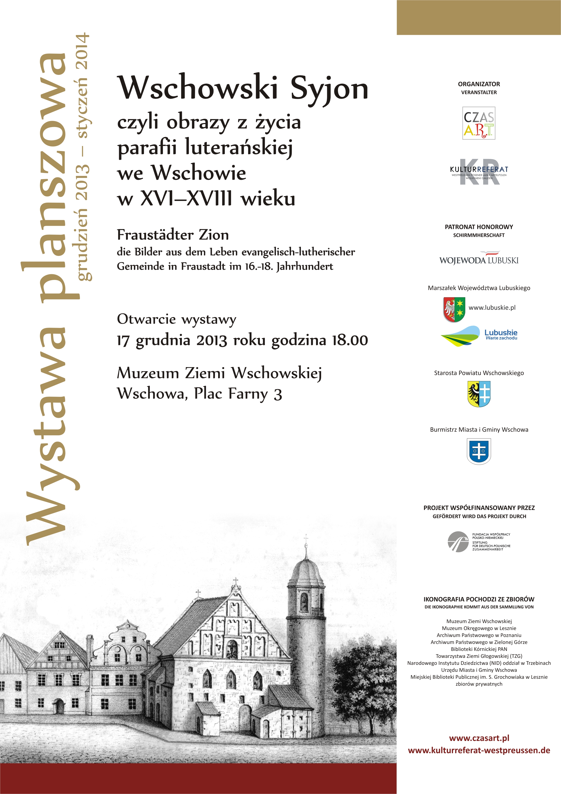 Wystawa pt. „Wschowski Syjon czyli obrazy z życia wschowskiej parafii luterańskiej w XVI – XVIII wieku” powstała w ramach realizacji projektu: „Reformacja i tolerancja. Jedność w różnorodności? Współistnienie różnych wyznań na ziemi wschowskiej”.