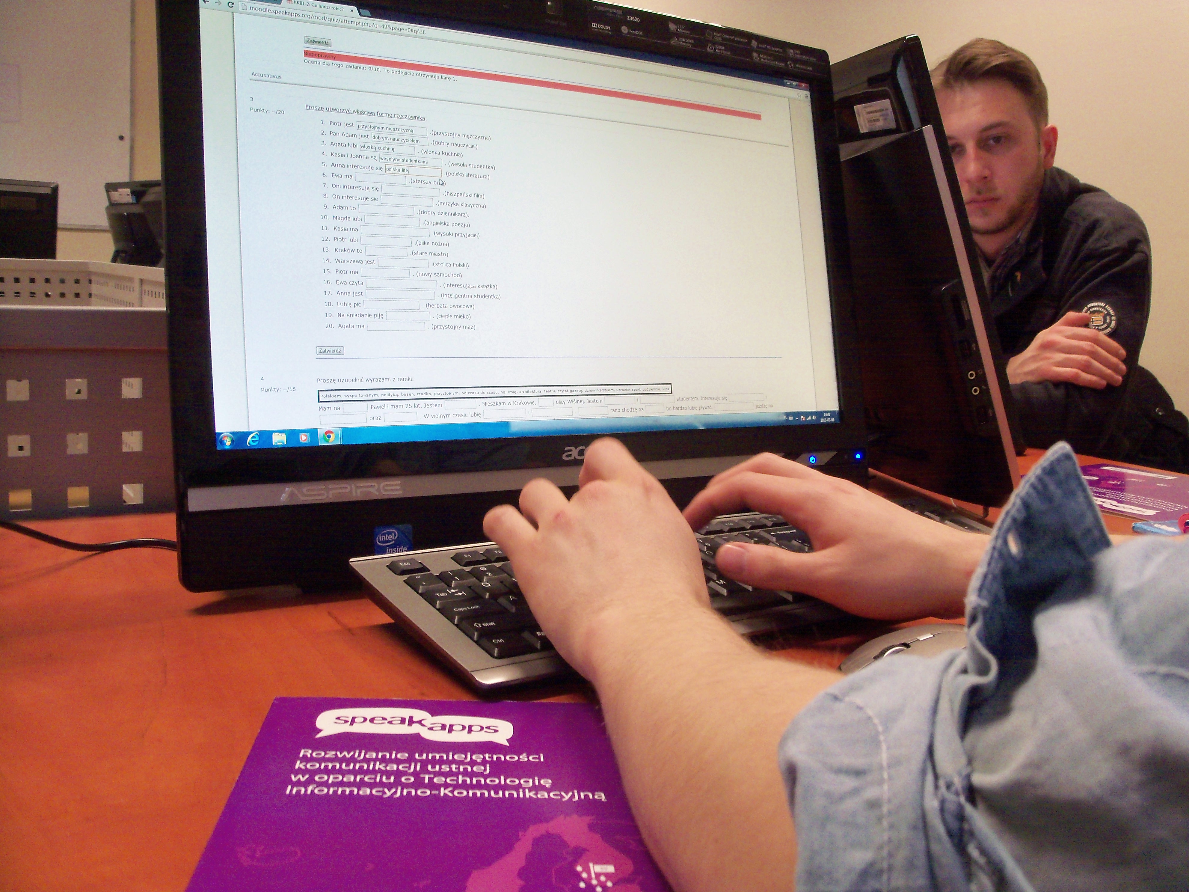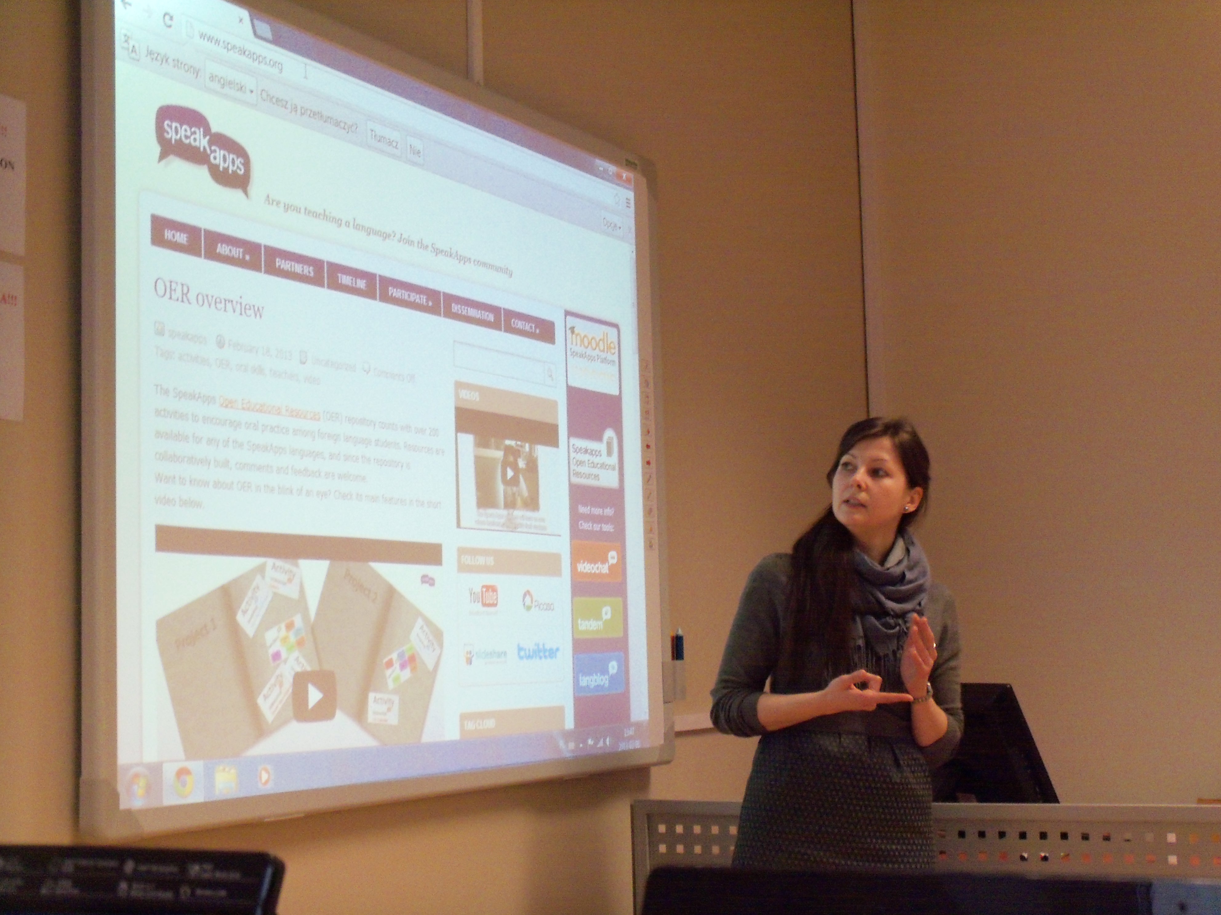 Podczas warsztatów studenci mogli poznać zasady korzystania ze SpeakApps. Przewodniczką po niej była dr Adrianna Prizel-Kania. Aplikacja pozwala komunikować się członkom grupy za pomocą wideo czatu i dzielić ciekawymi materiałami znalezionymi w internecie. Przez SpeakApps mogą też kontaktować się z tutorem, który sprawdzi im w ten sposób ćwiczenia.
