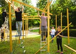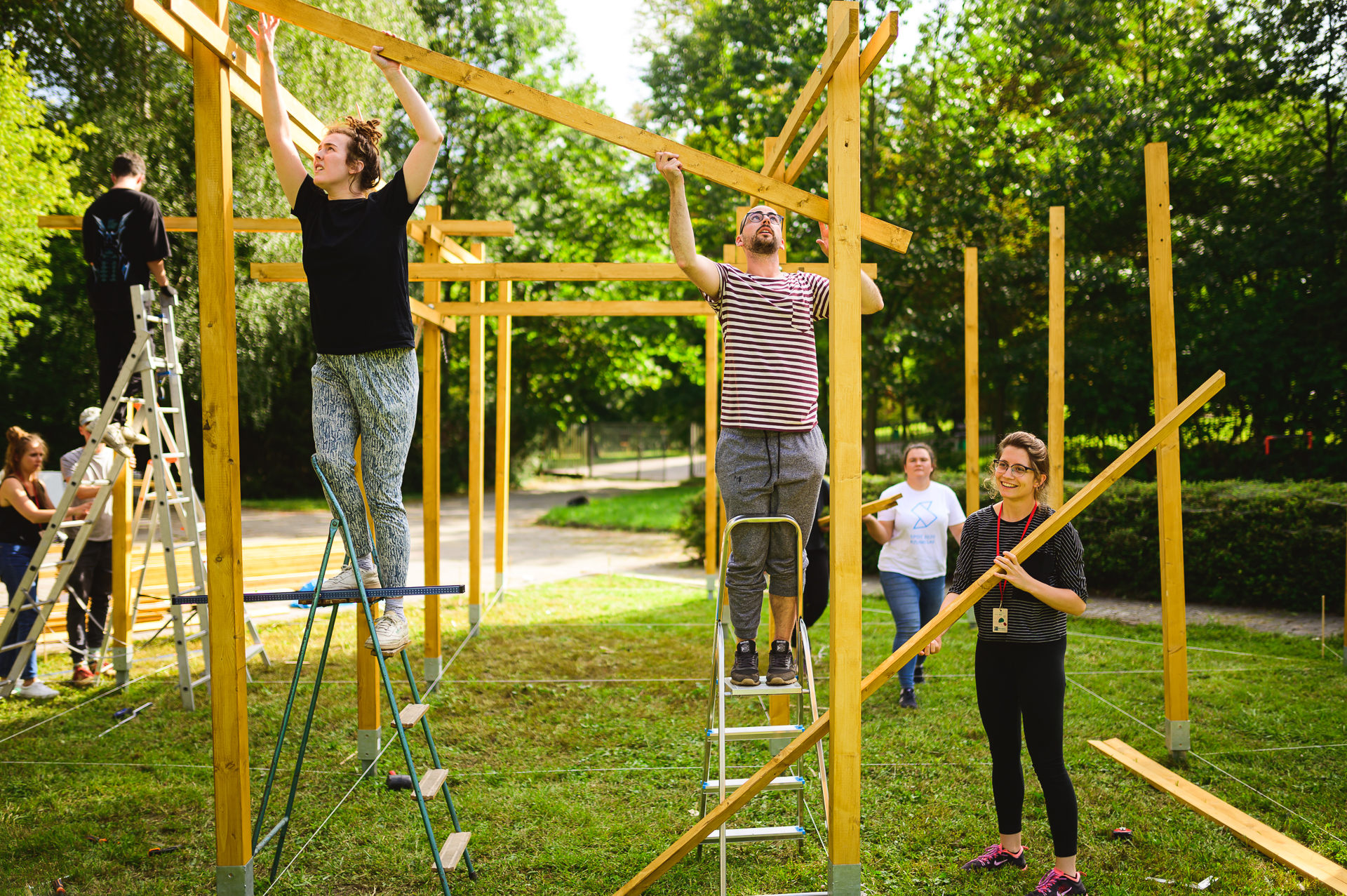 Realizacja projektów zajęła największą część programu. Studenci ciężko pracowali od rana do wieczora. Szczególnie w drugiej połowie tygodnia, gdy widmo prezentacji wisiało nad ich głowami. Drewniane konstrukcje już w ostatni weekend sierpnia wypełniły zieloną przestrzeń Ogrodu Szeląg oraz podwórko Domu Opieki Społecznej Ugory. W Ogrodzie Szeląg powstał Pawilon Śliwkowy (Plum Pavilion) - miejsce dedykowane warsztatom ceramiki i ekspozycji wyrobów ceramicznych. Swoją nazwę wziął od drzewa śliwkowego, które rośnie w samym sercu pawilonu. Projektanci potraktowali drzewo jako integralną część konstrukcji. Grupa pod okiem Adama Wiercińskiego zrealizowała projekt na zlecenie właściciela ogrodu. Tuż obok, Nils Wenk i jego współpracownicy postawili konstrukcję o nazwie Steps. To miejsce kontemplacji dla dorosłych, które jednocześnie będzie skrytką dla dzieci. Motywem przewodnim projektu był widok na Wartę. W zielonym parku dzielnicy Szeląg znajduje się Dom Opieki Społecznej Ugory. Po długich rozmowach z jego mieszkańcami dwie grupy zaprojektowały system ławek na taras ośrodka oraz pergolę w centralnej części podwórka. Pierwszy pomysł pod nazwą Bennnnnnnnnch nadzorowali założyciele Construction Lab: Mascha Fehse i Marius Busch. Wspólnie z nimi grupa studentów stworzyła miejsce odpoczynku, które jednocześnie zachęcało do wspólnego spędzania czasu mieszkańców ośrodka. - Długo zastanawialiśmy się nad formą i kształtem. Powstało wiele prototypów. Zdecydowaliśmy, że komfort i wygoda osób, dla których projekt powstaje, są najważniejsze. Dlatego postawiliśmy na konstrukcję prostą i solidną — mówili przedstawiciele grupy. Pan Włodek, jeden z mieszkańców ośrodka, zapytany o to, jak mu się podoba całe przedsięwzięcie, skwitował krótko: elegancko. Pergola foREST grupy pod opieką Katarzyny Furgalińskiej i Łukasza Smolarczyka powstała z potrzeby cienia. Zajęła centralne miejsce podwórka i życia społecznego Domu Opieki. Konstrukcja nawiązuje do lasu poprzez wielopoziomowość sklepienia oraz różne formy cienia, jakie oferuje. Wyróżnione w nazwie słowo REST (ang. odpoczynek) oddaje cel, do jakiego została zaprojektowana. W obrębie pergoli studenci zainstalowali kilka ławek, a sklepienie obsadzili bluszczem.