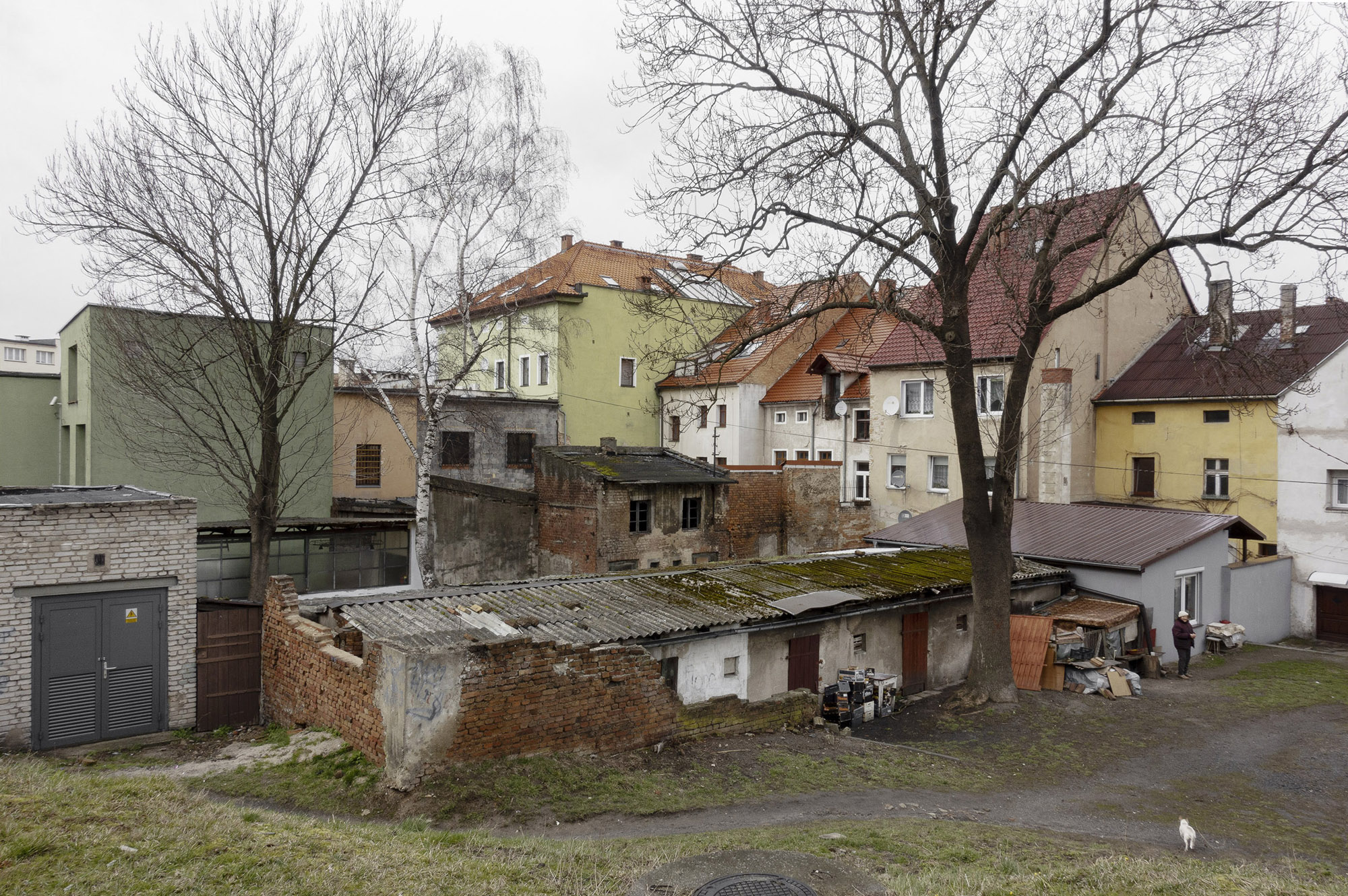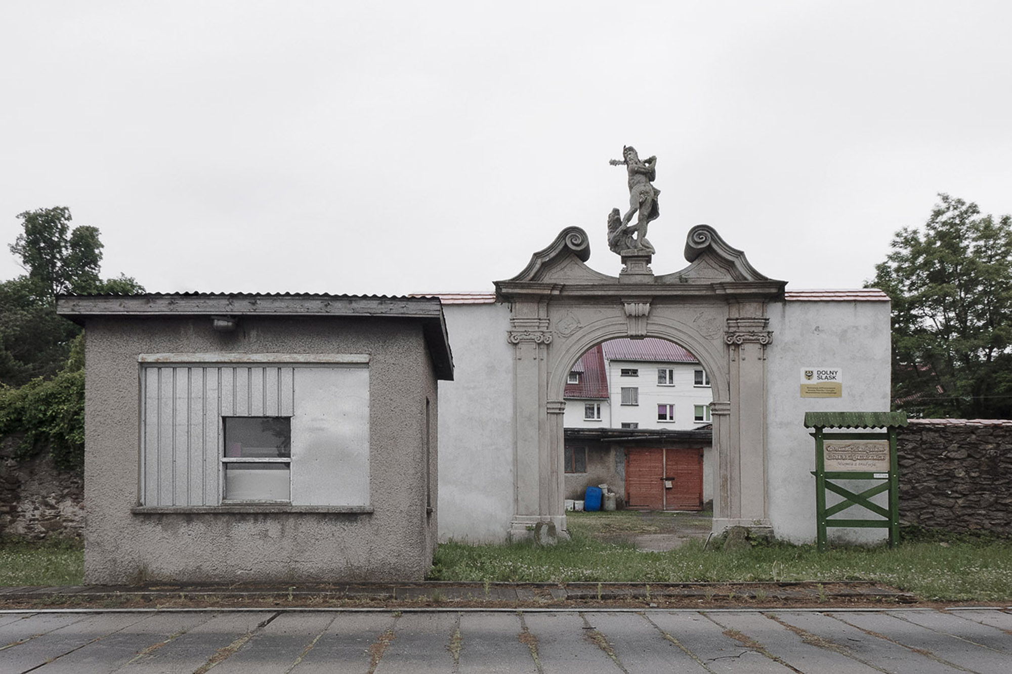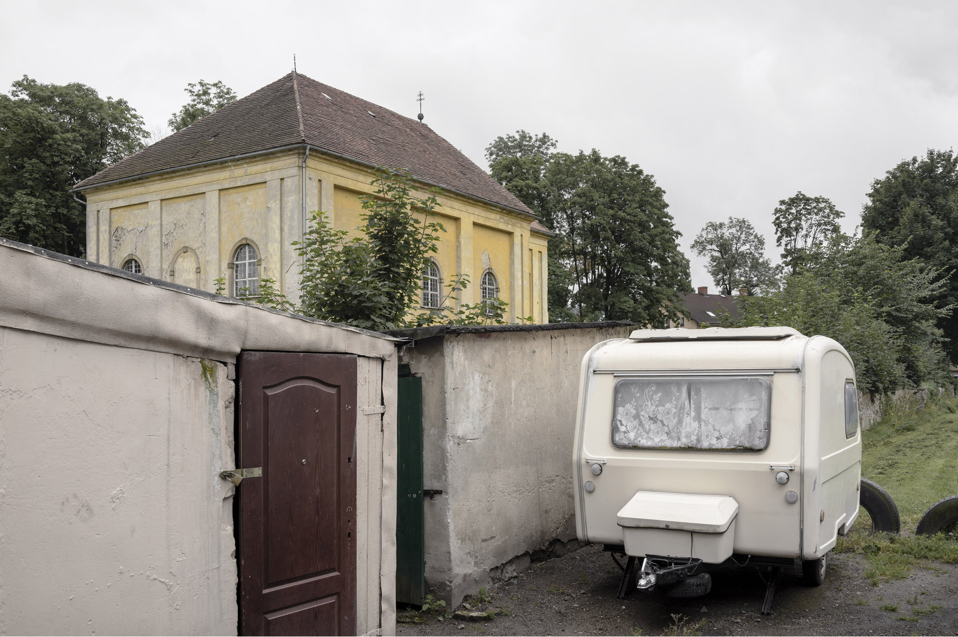 Mały, biały dom – na oko dwudziestoletni. Pod oknem sterta drewna, jakieś krzesło. Za metalowym ogrodzeniem stoi zaparkowany Golf. Po drugiej stronie ulicy budynek, który musiał powstać, kiedy były tu jeszcze Niemcy. Tuż za nim wznosi się ceglany, neogotycki kościół. Pobieżny opis nie oddaje klimatu fotografii wykonanej najpewniej wczesną wiosną, kiedy słońce kryło się za chmurami. Gdzie i kiedy zrobiono zdjęcie? Nie wiadomo. Autorzy oszczędzają szczegółów, ostrożnie dawkują informacje. Równie ostrożne wydaje się ich podejście do przedstawianych miejsc. Nie znajdziecie w Nieswojości pocztówkowych, czy najbardziej „instagramowych” ujęć Dolnego Śląska. Zobaczycie za to przyczepę kempingową rodem z PRL, stojącą obok drewnianego składziku, do którego wstępu strzegą plastikowe drzwi. Biało-czerwoną flagę powiewającą na ruinach ceglanej budowli. Odpadające tynki sąsiadujące z pstrokato-kolorowymi fasadami. Fotografie Pankiewicz i Przybyłki uderzają surowością. Nie pokazują lukrowanej rzeczywistości, kolorowej fasady, która mogłaby być atrakcją turystyczną, ale miejsca zamieszkane, odwiedzane, użytkowane przez ludzi, których rodzice, dziadkowie, pradziadkowie przybyli z różnych miejsc. I podjęli próbę oswojenia nieznanych przestrzeni. Autorzy za pomocą fotografii pokazują efekty przesunięcia granic i masowych przesiedleń. Dolny Śląsk w ich ujęciu to kraina o niezdefiniowanej tożsamości, pełna kontrastów. Na większości zdjęć nie ma ludzi, a jeśli już, to w oddali. Pierwszoplanowymi aktorami są tu scenografie pozbawione aktorów. Obserwujemy tylko domy, samochody, rabaty kwiatowe, szyldy sklepów. Nieobecność ludzi wzmacnia poczucie tytułowej nieswojości. Przyglądam się detalom i próbuję znaleźć odpowiedź: dlaczego ten element tak bardzo różni się od sąsiadującego z nim? Nie znajduję wytłumaczenia chaosu. Fotografie zmuszają do zadawania pytań bez odpowiedzi – to właśnie stanowi siłę prac Pankiewicz i Przybyłki.